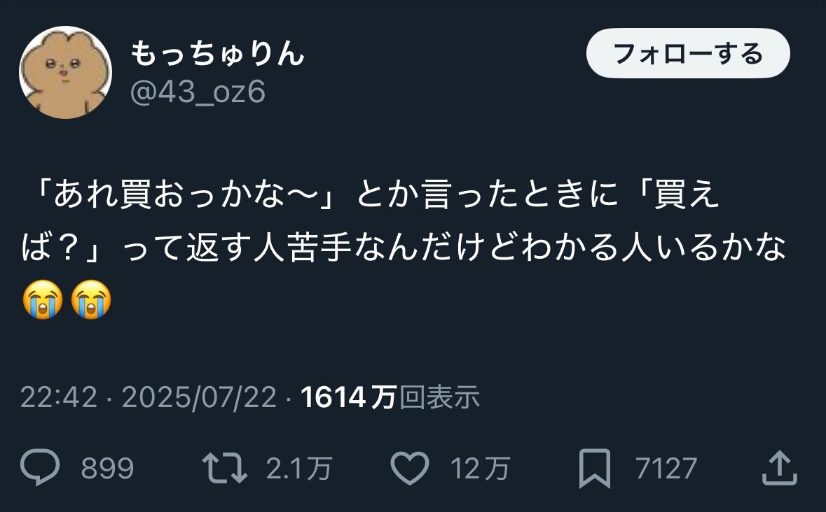 有識者「「あれ買おっかな~」に対して「買えば?」って言う人無理」→12万いいねの共感の嵐 2025/7/24 Y速報 " " 1: 2025/07/24(木) 00:56:44.40 ID:PLRqOKK/0 もちろんゲハ民はこんな回答しないよな 続きを読む Source: Y速報