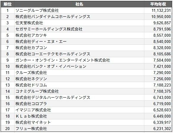 ゲーム業界の平均年収ランキングTOP20。バンダイナムコや任天堂を上回った1位は?