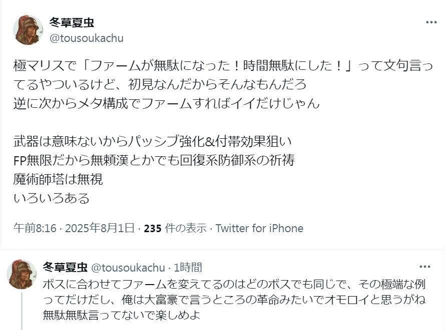 【画像】ワイルズやってそうなナイトレイナーが発見される 2025/8/2 ダークソウルまとめ速報 " " 45: ID:bohPlspg0.net ごもっともだな まずは楽しむ姿勢を持てよ 続きを読む Source: ダークソウルまとめ速報