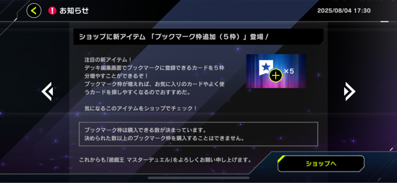 【速報】ショップに新アイテム「ブックマーク枠追加(5枠)」登場他