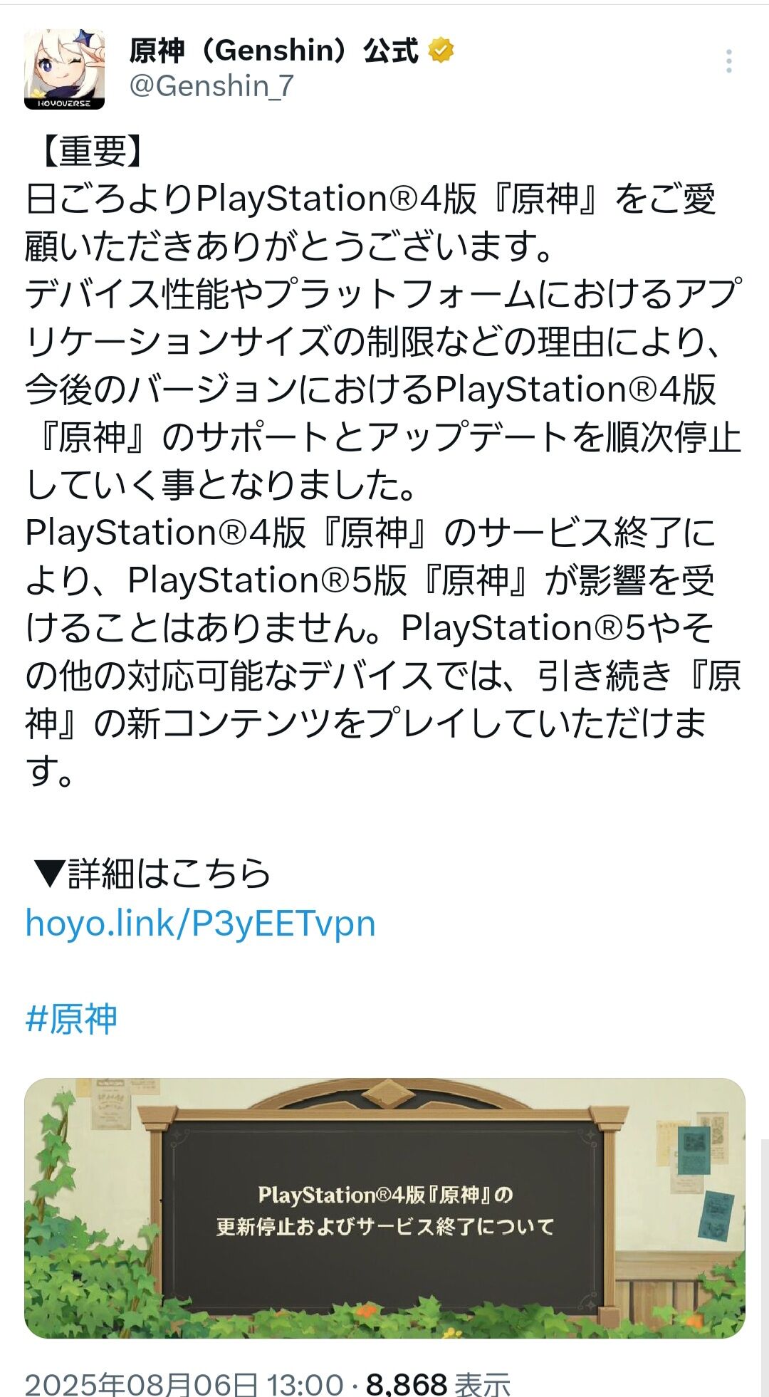 【草】PS4版『原神』さん、サービス終了へ 2025/8/6 ゲーム実況者速報 " " 1: ゲーム実況者速報 2025/08/06(水) 13:04:07.31 ID:PwUsCFXF0 続きを読む Source: ゲーム実況者速報