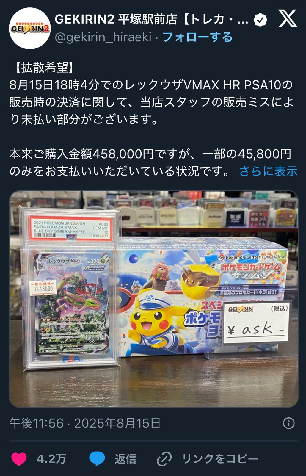 客「お、ポケカ4.5万円じゃん、買お」店員「───45万」 2025/8/17 Y速報 " " 1: 2025/08/17(日) 09:17:23.07 ID:ZFJhnk960 4万ごときでポケカを遊べると思うな 続きを読む Source: Y速報