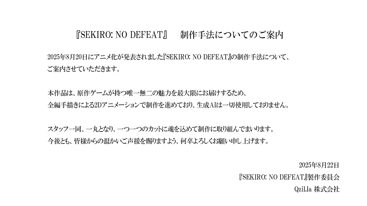 「SEKIRO」アニメの生成AI使用疑惑に対してスタジオが発表「AIは一切使用しておりません」 2025/8/24 Y速報 " " 1: 2025/08/23(土) 15:49:46.14 ID:z7CkjE+v0 コメント 続きを読む Source: Y速報