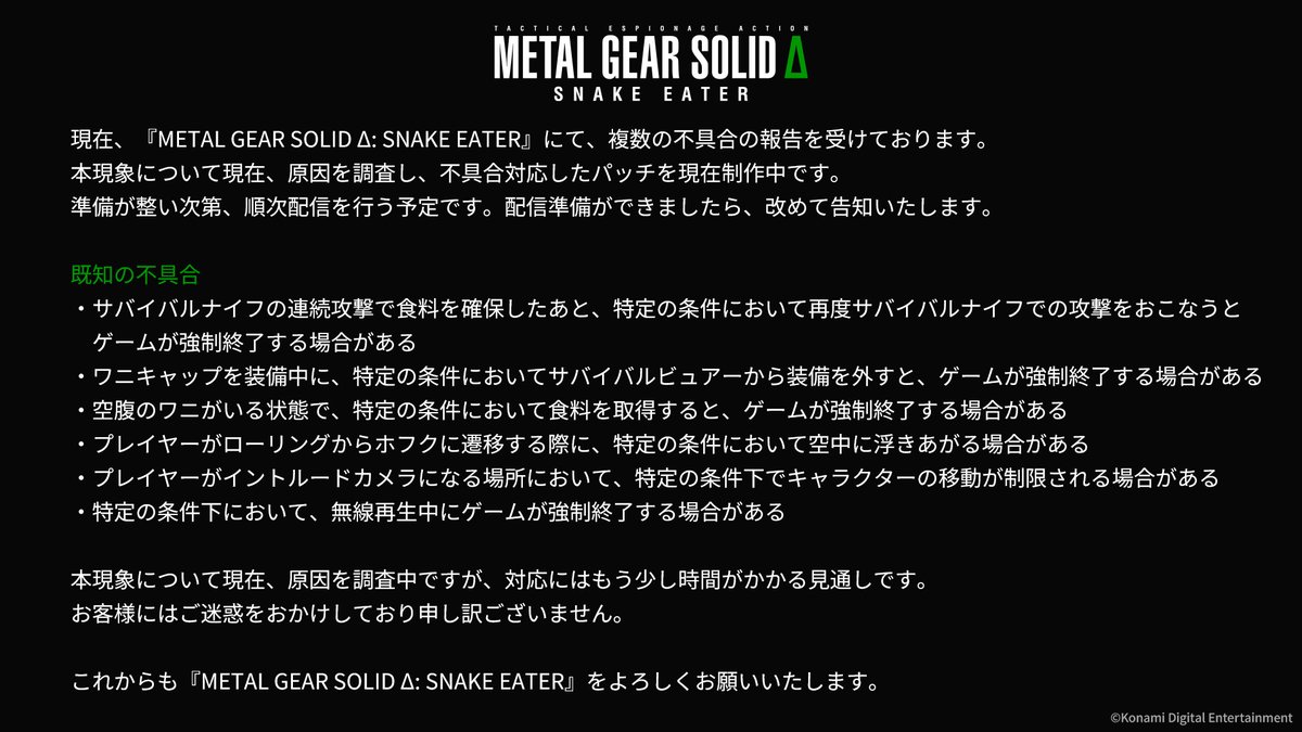 メタルギアソリッドΔ、様々な状況でゲームが強制終了するバグが多発している模様 2025/8/28 Y速報 " " 1: 2025/08/27(水) 20:34:18.10 ID:9GDRyN8T0 『METAL GEAR SOLID Δ: SNAKE EATER』 不具合に関するお知らせ 現在、複数の不具合報告を受けております。 各現象について、不具合対応したパッチを現在制作中です。 配信準備ができましたら、改めて告知いたします。 続きを読む Source: Y速報