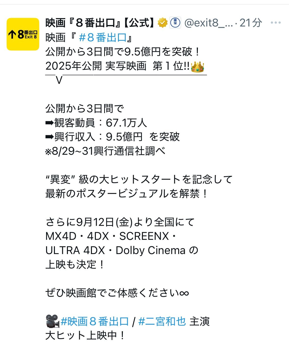 映画「8番出口」、国宝を抜いて今年の実写No. 1に 2025/9/1 Y速報 " " 1: 2025/09/01(月) 14:33:29.72 ID:v+NJAvRK0 すげえええ 続きを読む Source: Y速報