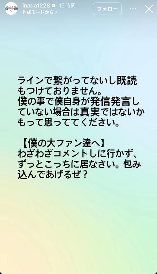 しかし稲田は、コレコレの発信に反応したのか、「ラインで繋がってないし既読もつけておりません」と報告。「僕の事で僕自身が発信発言していない場合は真実ではないかもって思っててください」と注意をうながしつつ、「【僕の大ファン達へ】わざわざコメントしに行かず、ずっとこっちに居なさい。包み込んであげるぜ?」と呼びかけた。