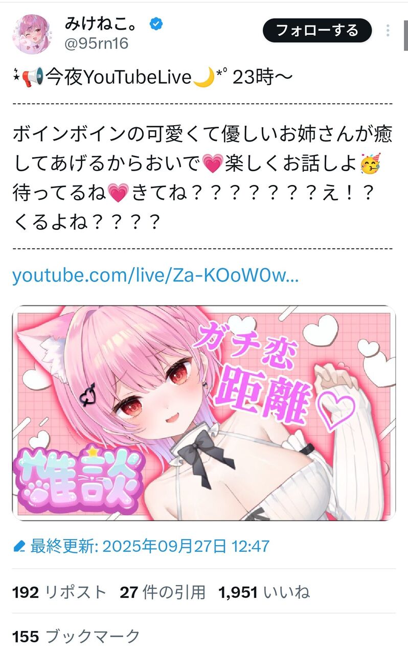 【弱男営業】みけねこさん、とんでもないガチ恋配信を始めるwwwwwwwwww 2025/9/29 ゲーム実況者速報 " " 1: ゲーム実況者速報 2025/09/27(土) 21:20:05.244 ID:IYDzGIzC0 続きを読む Source: ゲーム実況者速報