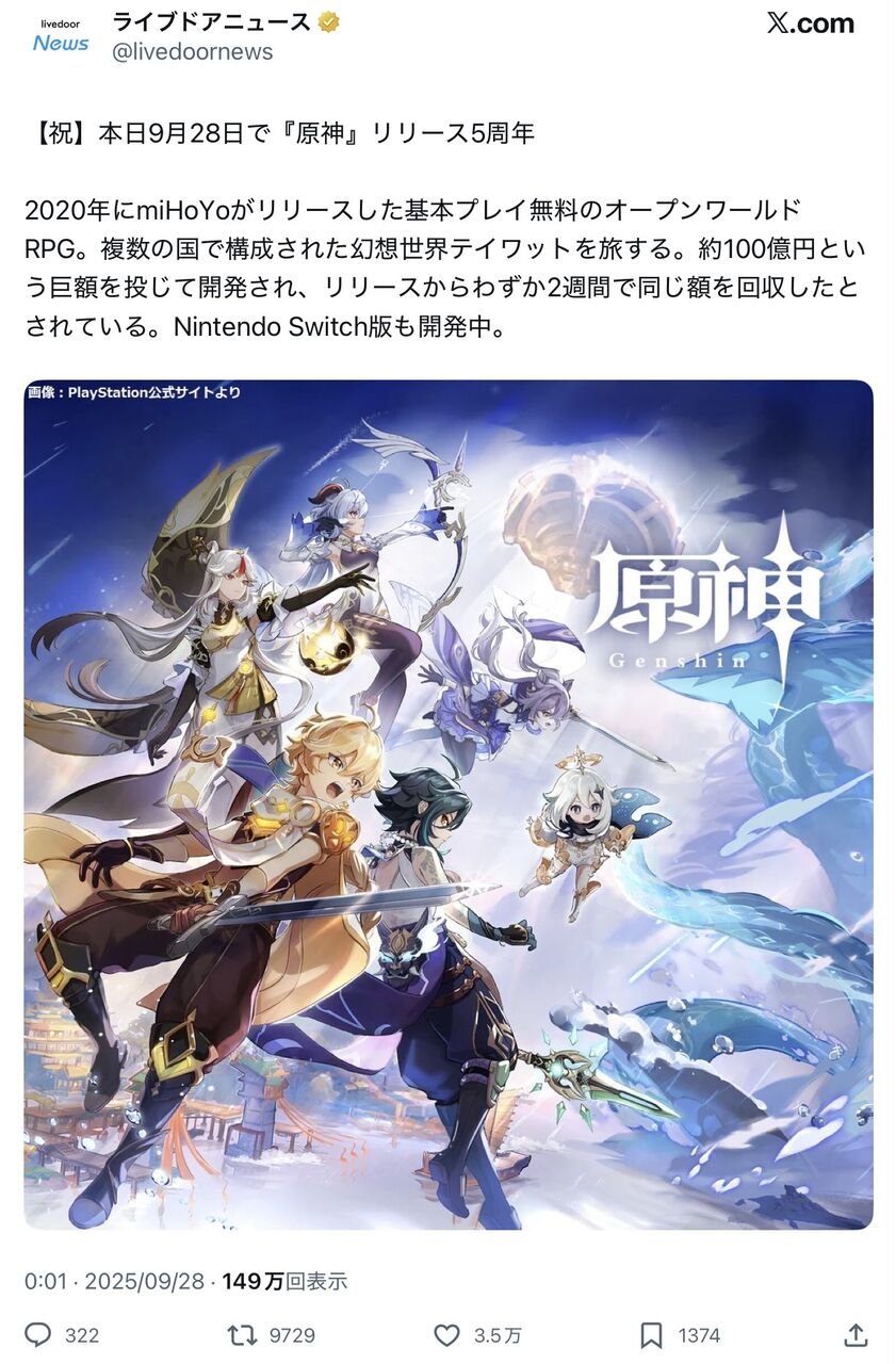 【朗報】原神さん、5周年でスイッチ1版も鋭意開発中wwwwwwwwww 2025/9/30 ゲーム実況者速報 " " 1: ゲーム実況者速報 2025/09/28(日) 15:31:43.21 ID:g+WSZ7no0 やったぜ 続きを読む Source: ゲーム実況者速報