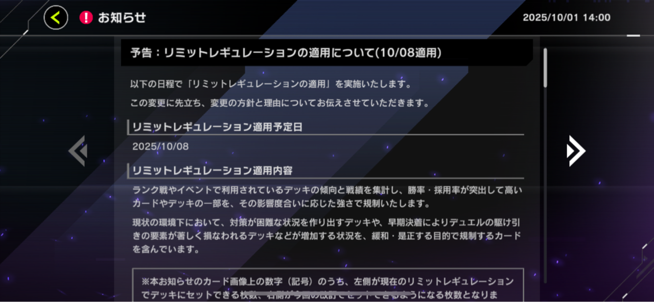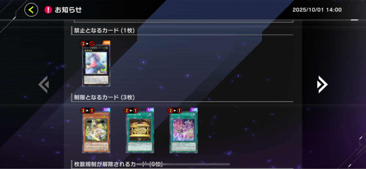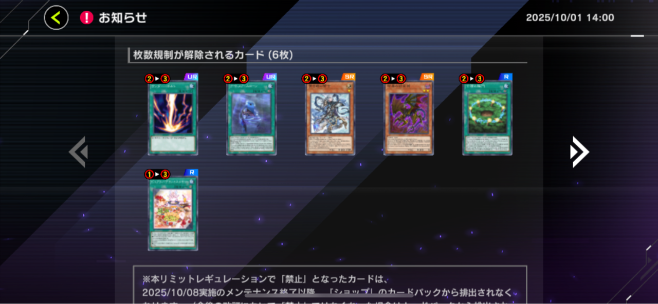 【速報】リミットレギュレーションを10/8適用 「バグースカ」禁止「ドーマウス」「黄金櫃」制限 2025/10/1 遊戯王デュエルリンクス超速報! " " 続きを読む Source: 遊戯王デュエルリンクス超速報!