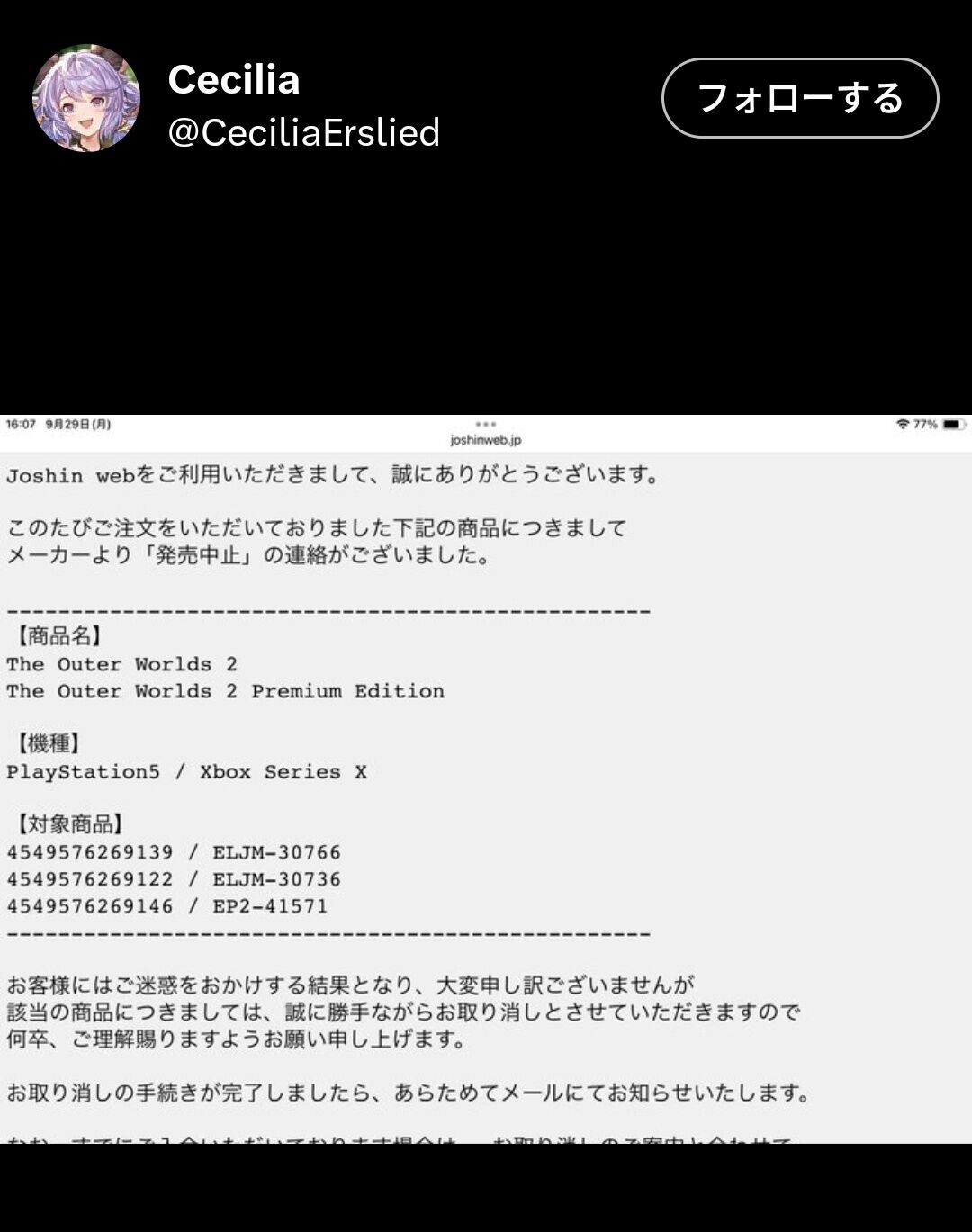 『アウター・ワールド2』パッケージ版、発売中止へ 2025/10/1 Y速報 " " 1: 2025/09/30(火) 19:47:11.81 ID:DxxPnTkRr 相当予約が集まらなかったもよう 続きを読む Source: Y速報