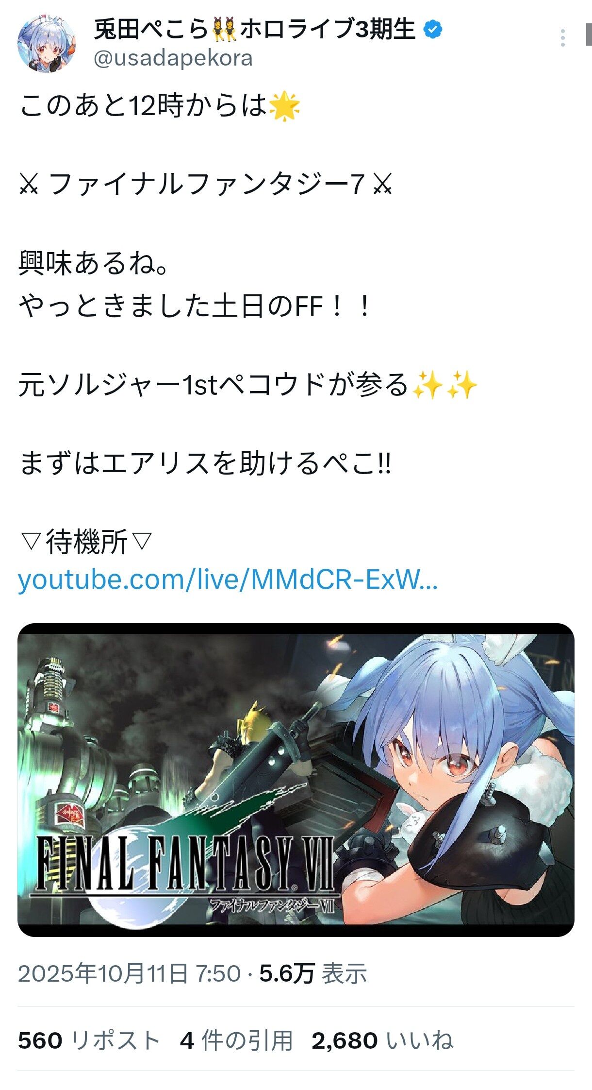 超人気Vチューバーさん、今日も元気にFF7を配信!お前ら今すぐ見ろwwwwwwwwww 2025/10/11 ゲーム実況者速報 " " 1: ゲーム実況者速報 2025/10/11(土) 10:23:56.997 ID:bem6pGeX0 続きを読む Source: ゲーム実況者速報
