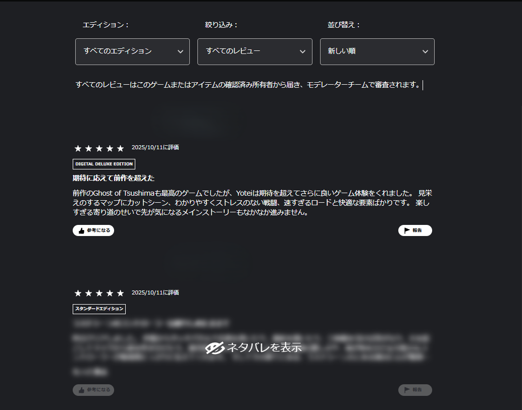 ※『Ghost of Yotei』レビュー (日本語 10/12 1:00 時点) ニックネームやアイコンは念のため消しています。
