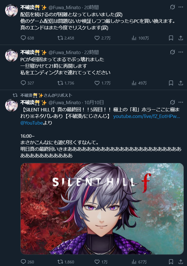 【悲報】大人気Vチューバーさん、サイレントヒルf配信で4回クラッシュしてまるでPCがぶっ壊れた模様 2025/10/12 ゲーム実況者速報 " " 1: ゲーム実況者速報 2025/10/12(日) 18:48:00.69 ID:CsyJjhvP0 続きを読む Source: ゲーム実況者速報