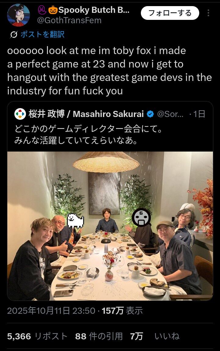 【悲報】海外ゲーマー、桜井政博の会合写真にブチギレwwwwwwwwwwwwwwwwww 2025/10/13 Y速報 " " 1: 2025/10/13(月) 09:43:47.75 ID:yKT351xD0 はい 続きを読む Source: Y速報