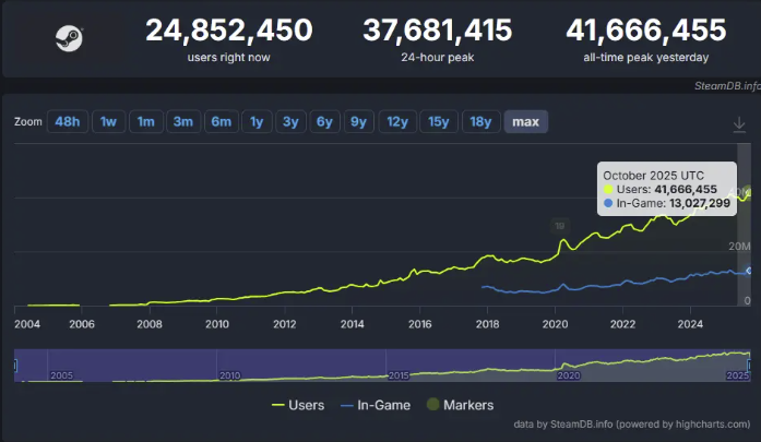 Steamの同時接続者数が4166万人を突破し、最高記録を更新。
