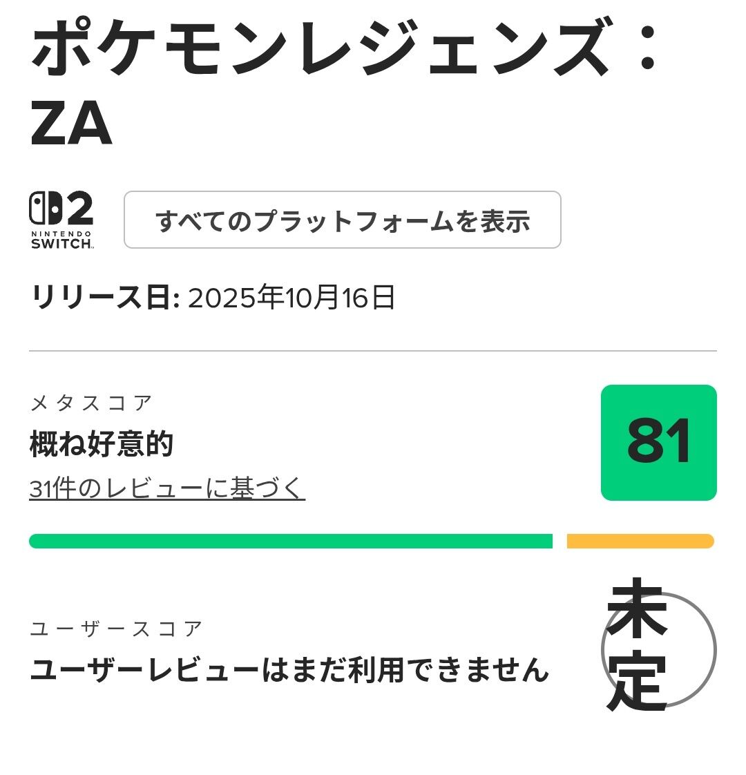 ポケモンレジェンズZA、メタスコア81点!!!! 2025/10/15 Y速報 " " 1: 2025/10/14(火) 22:25:58.76 ID:+DQ+KlFSd https://www.metacritic.com/game/pokemon-legends-z-a/ 続きを読む Source: Y速報