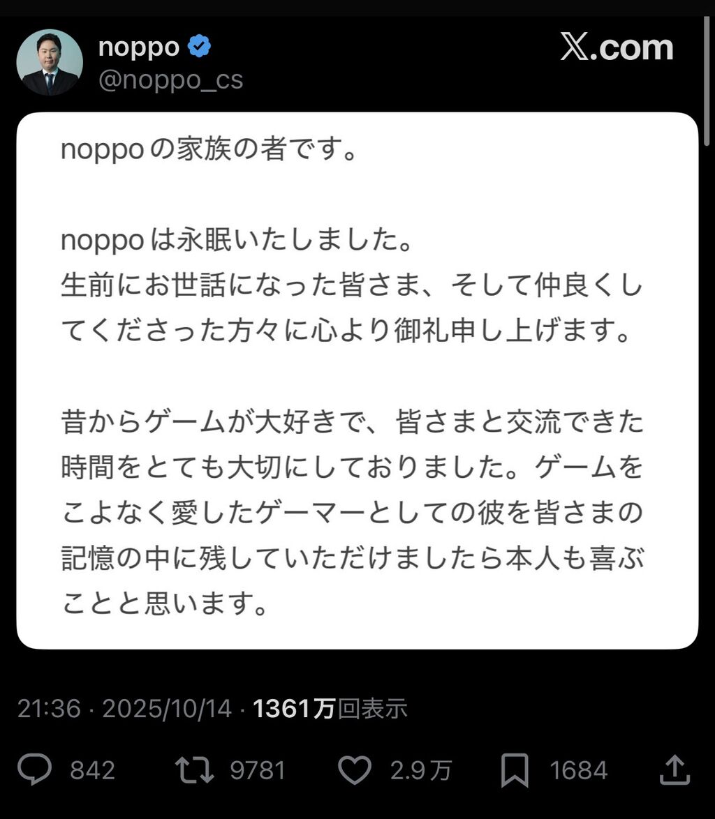 【訃報】元プロゲーマー「noppo」氏が逝去…… 2025/10/15 ゲーム実況者速報 " " 1: ゲーム実況者速報 2025/10/15(水) 12:27:49.85 ID:7RBZXFWA0 誰?禁止 続きを読む Source: ゲーム実況者速報