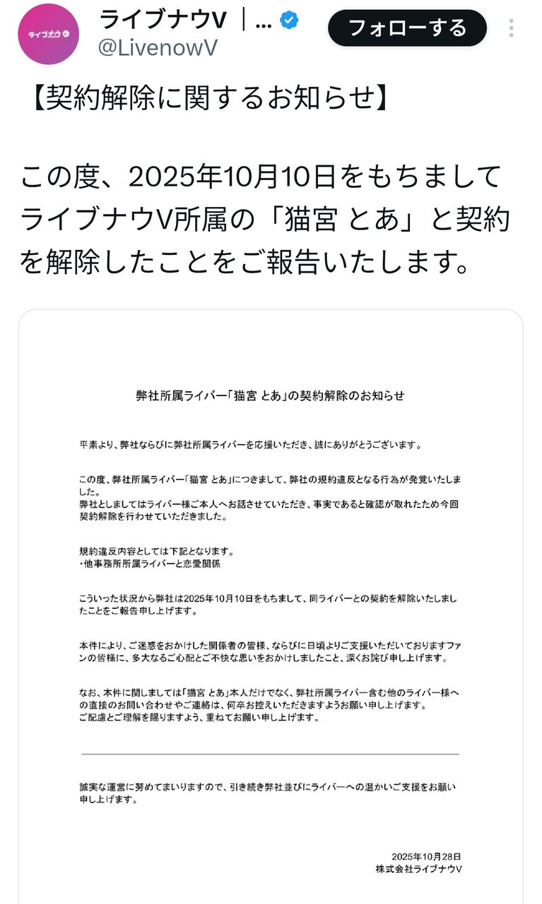 【悲報】Vチューバーさん、他事務所Vとの恋愛関係がバレて契約解除されてしまう…… 2025/10/29 ゲーム実況者速報 " " 1: ゲーム実況者速報 2025/10/28(火) 23:25:10.560 ID:p3vq0niYM さて相手は誰でしょ 続きを読む Source: ゲーム実況者速報