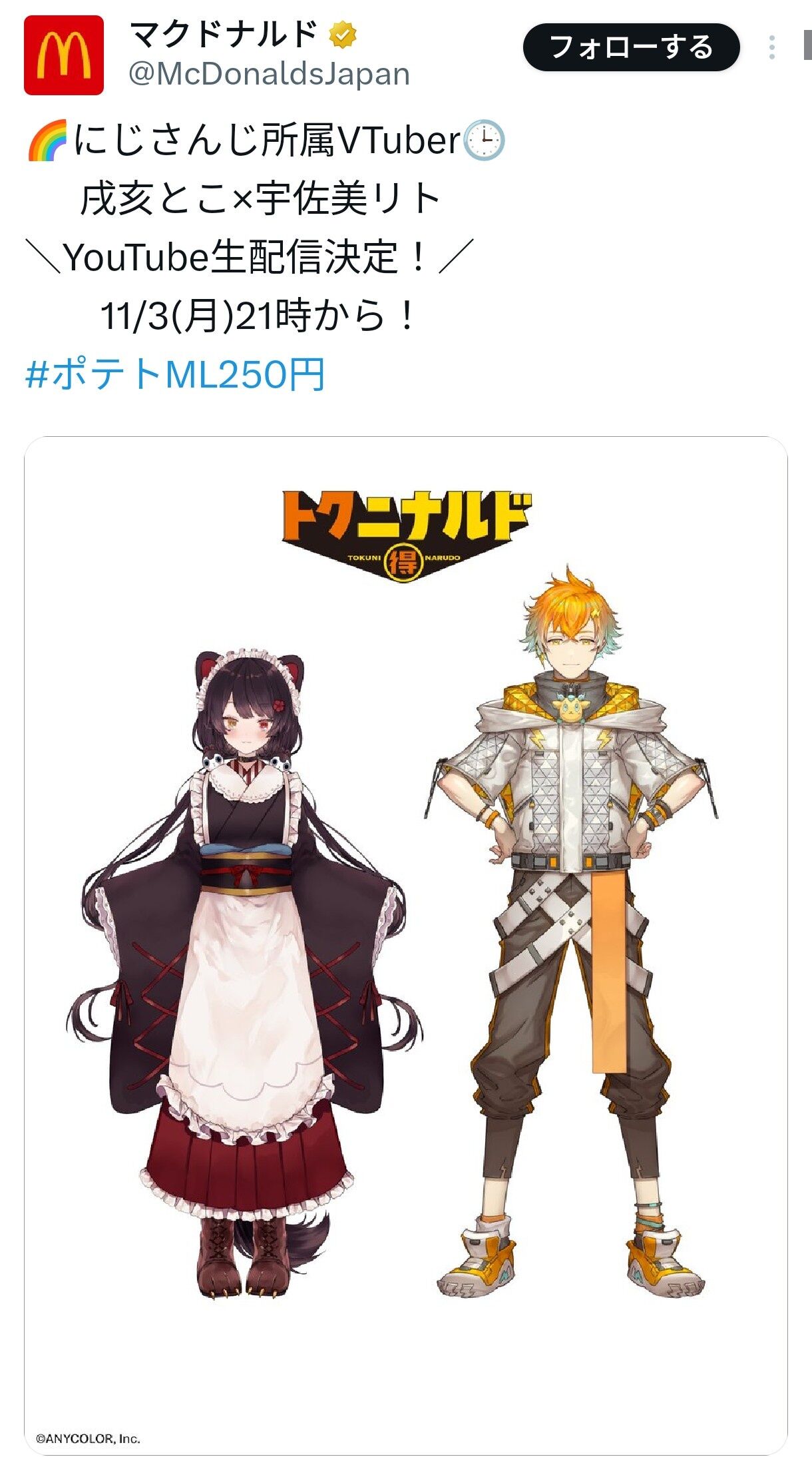 【朗報】大手Vグループさん、マクドナルドとのコラボキタ━━━━(゚∀゚)━━━━!! 2025/11/3 ゲーム実況者速報 " " 1: ゲーム実況者速報 2025/11/02(日) 21:32:26.093 ID:1aEEAxPC0 続きを読む Source: ゲーム実況者速報