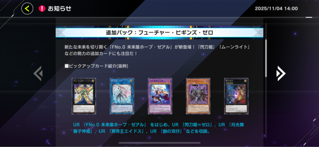 【速報】新パック「フューチャー・ビギンズ・ゼロ」を11/7追加 双子きたあああ!!! 2025/11/4 遊戯王デュエルリンクス超速報! " " 続きを読む Source: 遊戯王デュエルリンクス超速報!