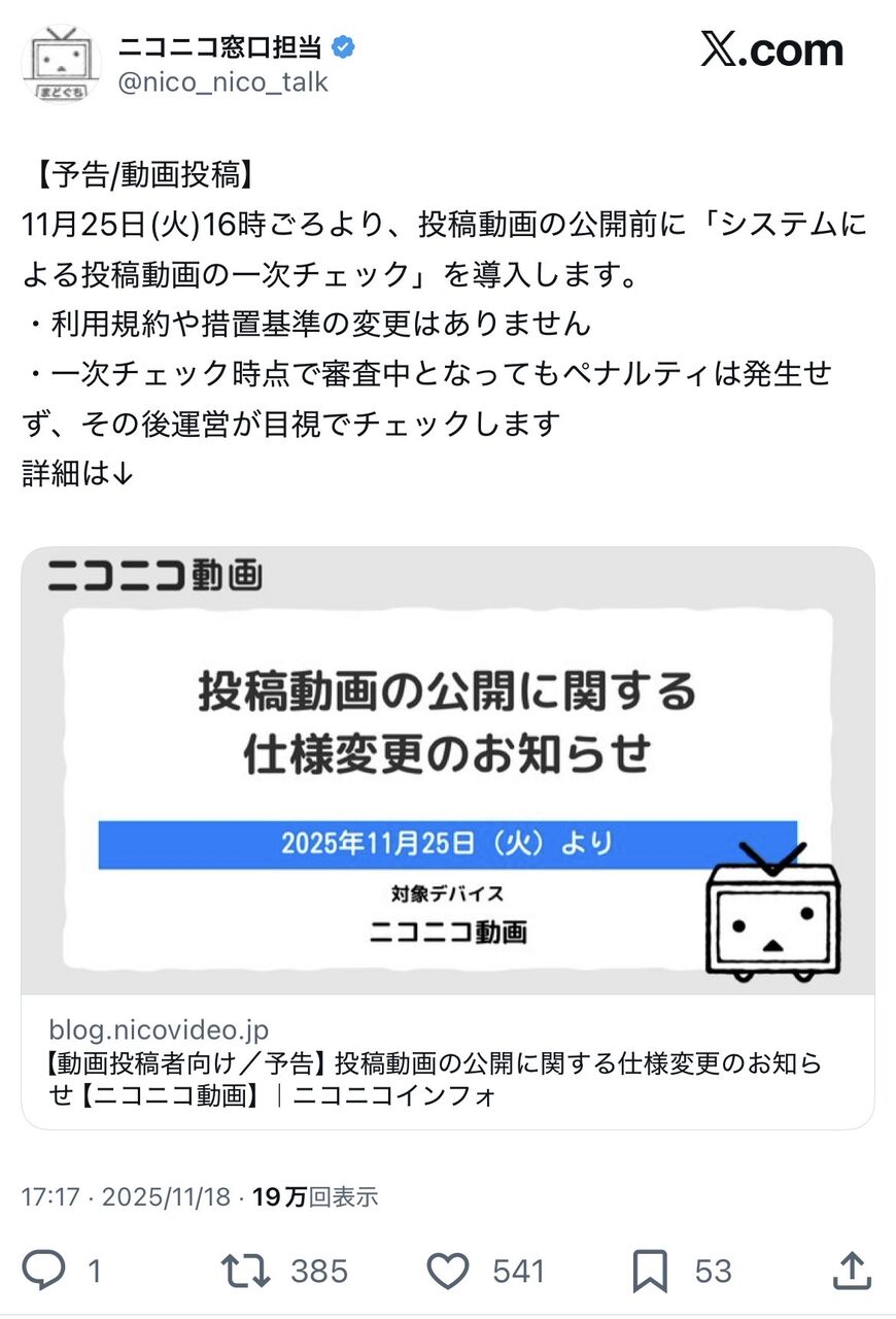 【悲報】ニコニコ動画さん、また終わる 投稿された動画をシステムによる一次チェック開始 2025/11/26 ゲーム実況者速報 " " 1: ゲーム実況者速報 2025/11/19(水) 12:43:30.15 ID:SK/iLIni0 続きを読む Source: ゲーム実況者速報