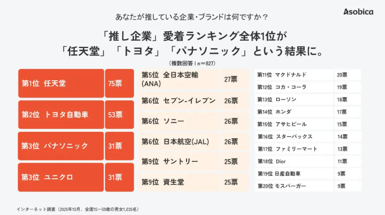 「推し企業」に対する愛着ランキングでは、全体1位が「任天堂」「トヨタ」「パナソニック」という結果に。
