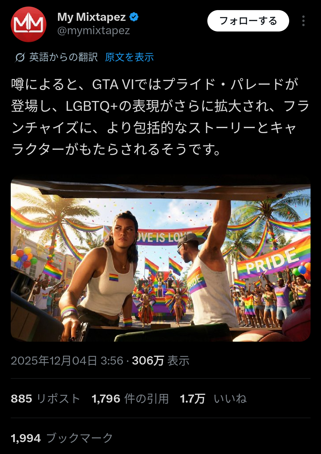 『GTA6』、LGBTQ+パレードが開かれるwwwwww 2025/12/5 Y速報 " " 1: 2025/12/05(金) 09:03:21.12 ID:Z+9wqAnk0 うへ 続きを読む Source: Y速報