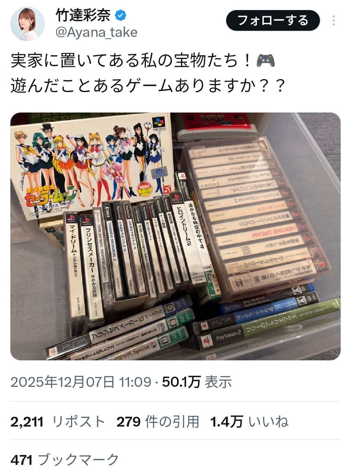 【朗報】大人気声優さん、持ってるゲームを大公開!!まさかの… 2025/12/8 Y速報 " " 1: 2025/12/07(日) 18:00:08.12 ID:UWvjulzj0 これは推せる 続きを読む Source: Y速報