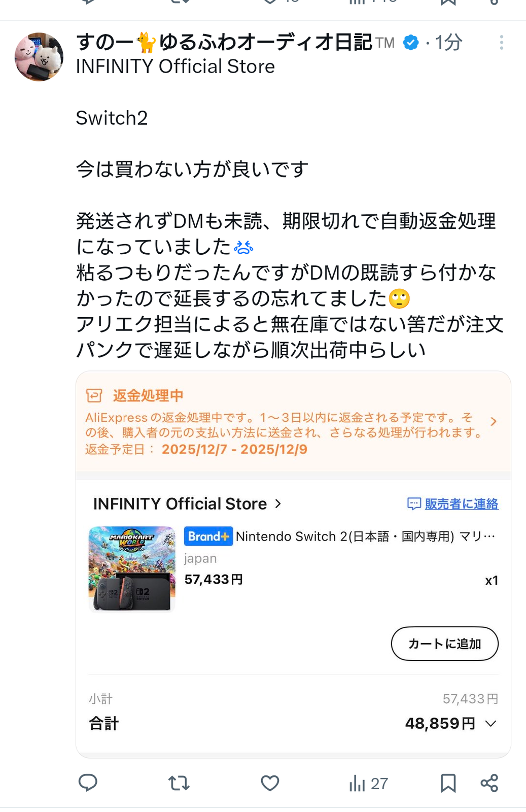 アリエクのSwitch2、注文した結果wwwwwwww 2025/12/8 Y速報 " " 1: 2025/12/06(土) 17:28:54.08 ID:yXefSIHO0 5万円切りのSwitch2、届かない詐欺だと発覚 続きを読む Source: Y速報