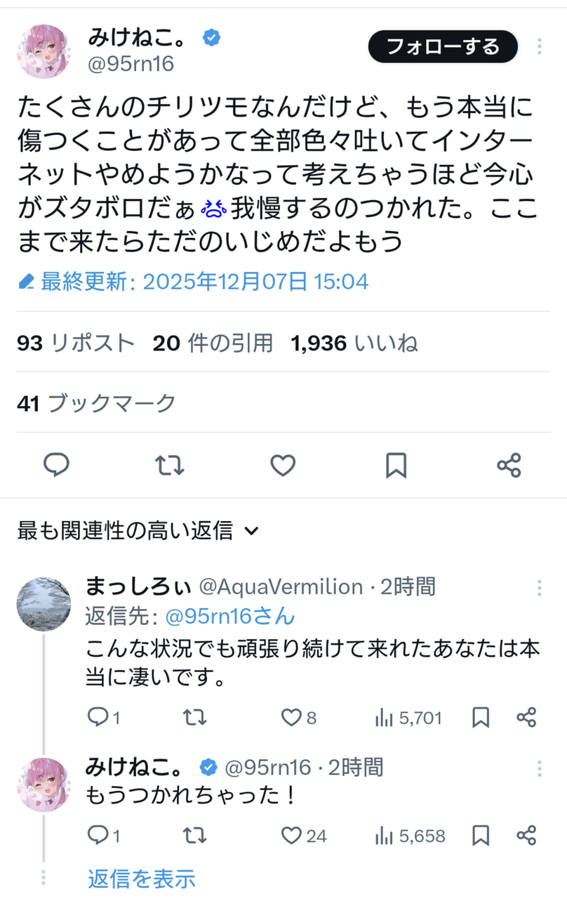 【悲報】みけねこさん、心がズタボロでもう限界 2025/12/10 ゲーム実況者速報 " " 1: ゲーム実況者速報 2025/12/07(日) 18:48:33.92 ID:5Bo7C9ue0 可哀想😢 続きを読む Source: ゲーム実況者速報