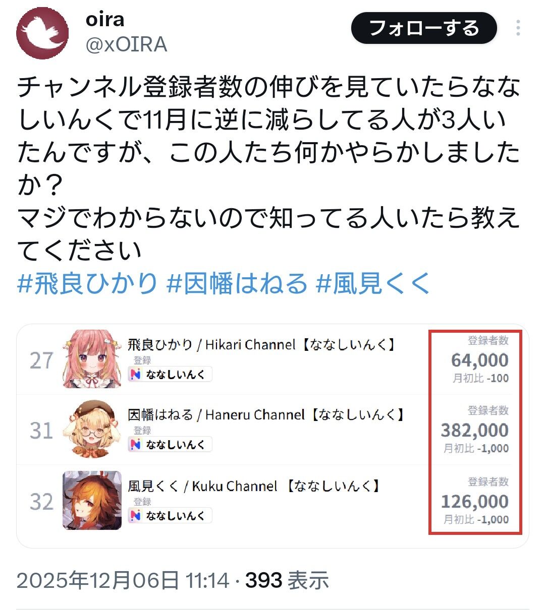 一方、因幡はねるらななしいんくライバー複数の登録者数が減少に転じる