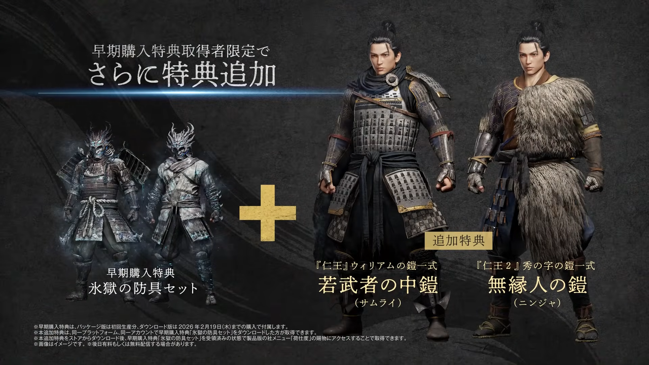 更に、早期購入特典をお持ちのプレイヤーの方に追加でウィリアム&秀の字の鎧もプレゼント!仁王3は2026年2月6日(金)発売