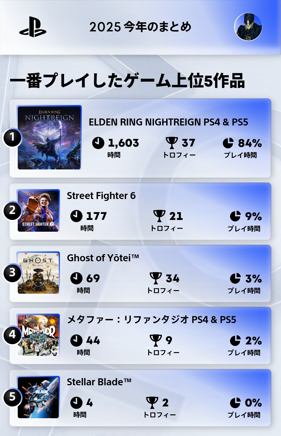 【ナイトレイン】PSNからきてた今年の総プレイ時間これって普通だよね? 2025/12/14 ダークソウルまとめ速報 " " 581: ID:AiSF4IfV0.net PSNからお知らせ来てたでしょ? お前らはどんな感じ? 続きを読む Source: ダークソウルまとめ速報