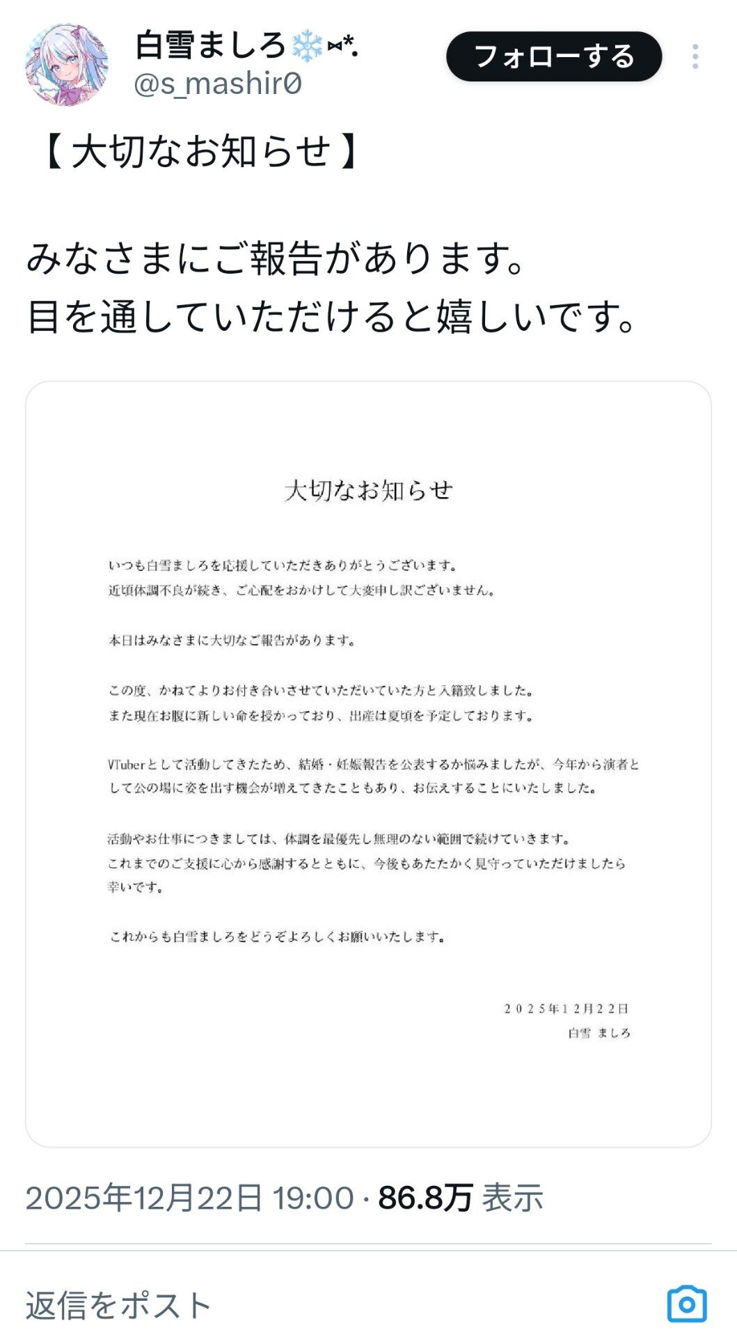 【えっ】あの有名Vチューバーさん、突然の結婚発表でバチャ豚が阿鼻叫喚wwwwwwwwww 2025/12/23 ゲーム実況者速報 " " 1: ゲーム実況者速報 2025/12/22(月) 22:32:42.823 ID:9POw3O5MM おめでとうございます😭 続きを読む Source: ゲーム実況者速報
