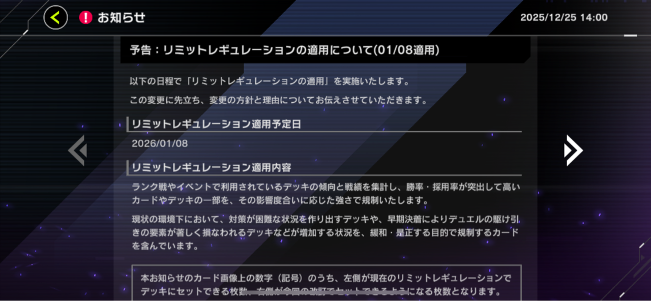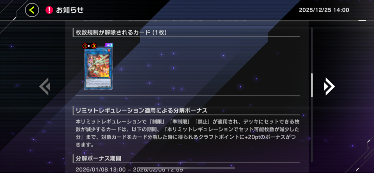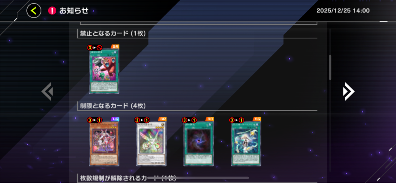【速報】リミットレギュレーションを1/8適用 「魔獣の懐柔」禁止「ホワイトラビット」制限他 2025/12/25 遊戯王デュエルリンクス超速報! " " 続きを読む Source: 遊戯王デュエルリンクス超速報!