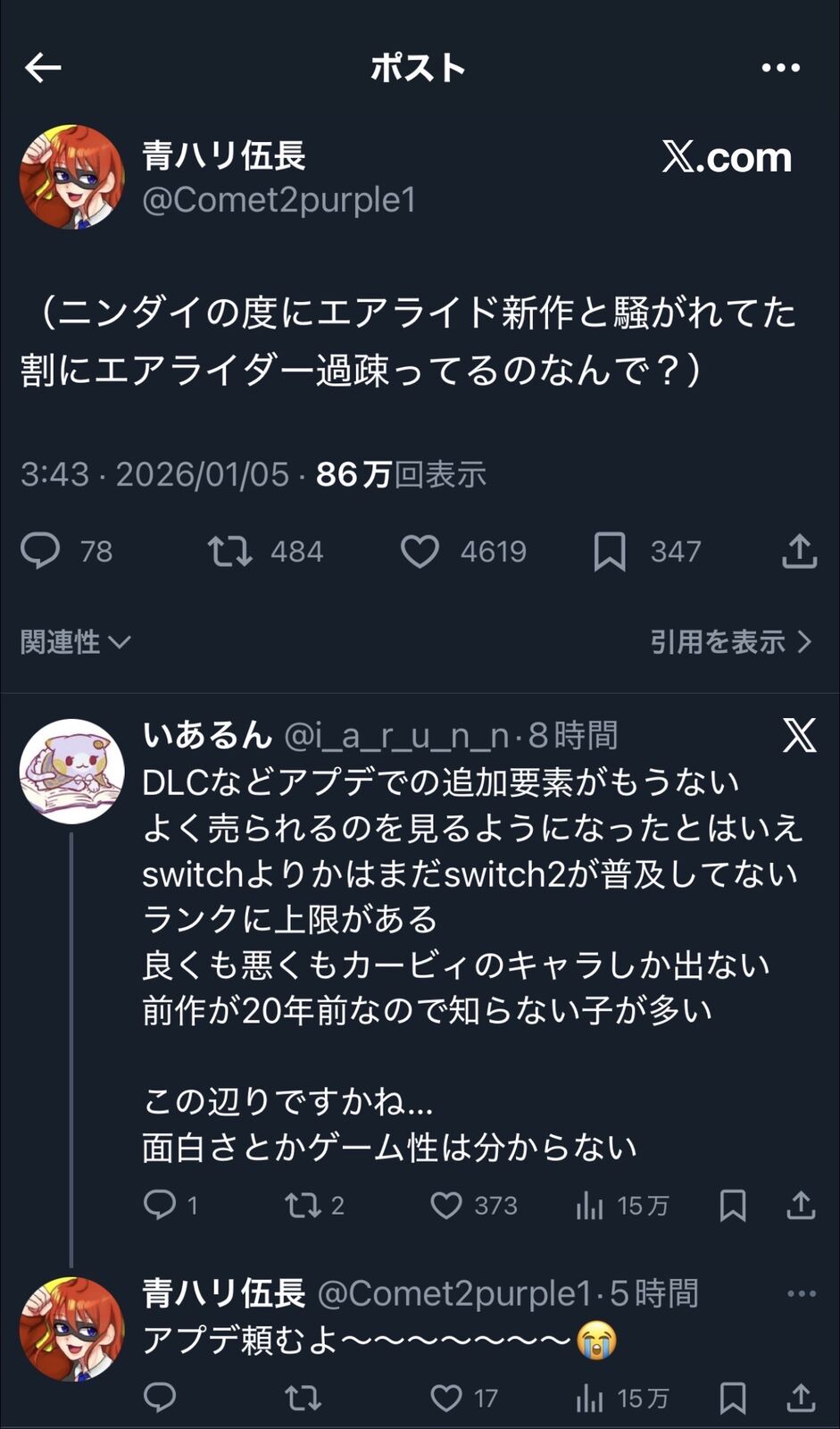 カービィのエアライダー、無事過疎化 2026/1/5 Y速報 " " 1: 2026/01/05(月) 12:57:26.52 ID:jPywImdh0 声のデカいオタクが騒いでただけのゲームやったね 続きを読む Source: Y速報