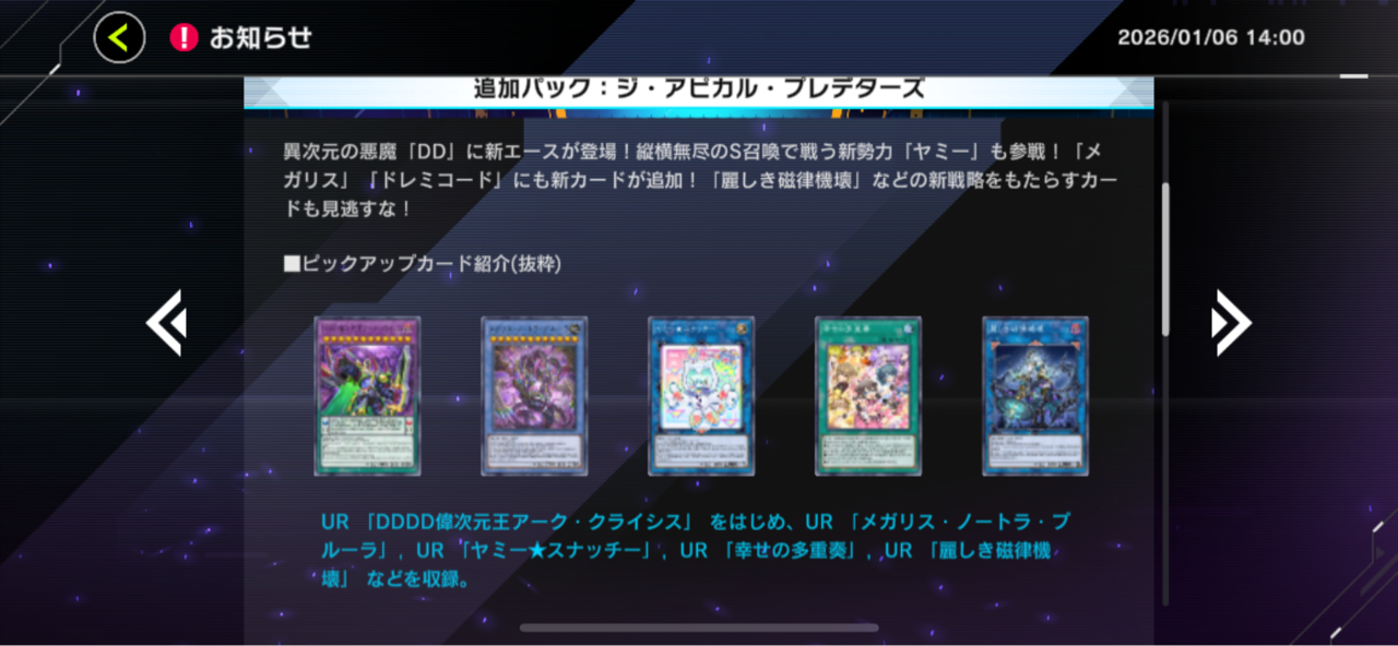 【速報】新パック「ジ・アビカル・プレデターズ」を1/8追加 「ヤミー」きたあああ!!! 2026/1/6 遊戯王デュエルリンクス超速報! " " 続きを読む Source: 遊戯王デュエルリンクス超速報!