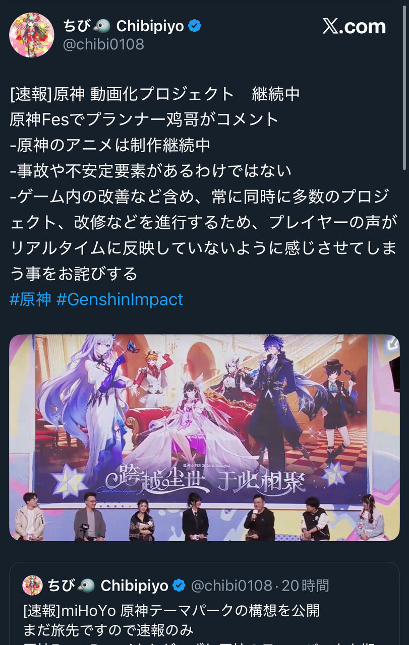 【朗報】原神さん、ufotable制作で全シリーズアニメ化! 2026/1/6 ゲーム実況者速報 " " 1: ゲーム実況者速報 2026/01/05(月) 08:55:48.70 ID:XnqxUoM90 https://dec.2chan.net/up2/src/fu6127356.webp 続きを読む Source: ゲーム実況者速報