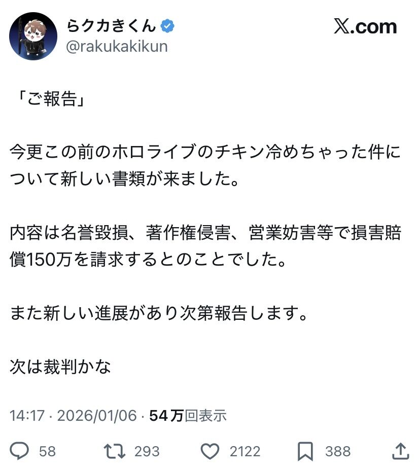 冷めチキイラストを描いて訴えられたX民さん、V事務所から新しい書類が届く…… 2026/1/8 ゲーム実況者速報 " " 1: ゲーム実況者速報 2026/01/06(火) 17:25:48.966 ID:f4w3ULjgd 続きを読む Source: ゲーム実況者速報