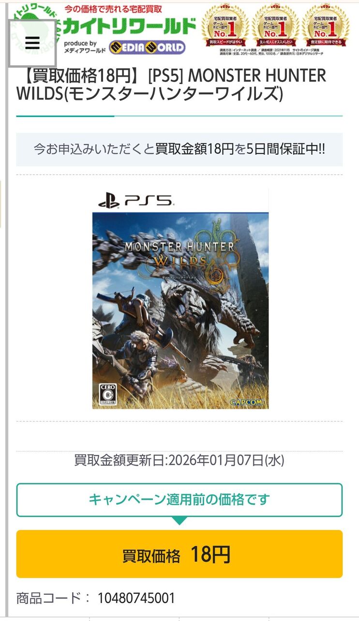 【悲報】モンハンワイルズさん、買取価格が18円にwwwwwwwwww 2026/1/9 ゲーム実況者速報 " " 1: ゲーム実況者速報 2026/01/08(木) 06:26:22.94 ID:g7r5T27W0 その価格、なんと16円! ついにモンハンワイルズの価格がもやしと同等の時代が到来した模様 続きを読む Source: ゲーム実況者速報