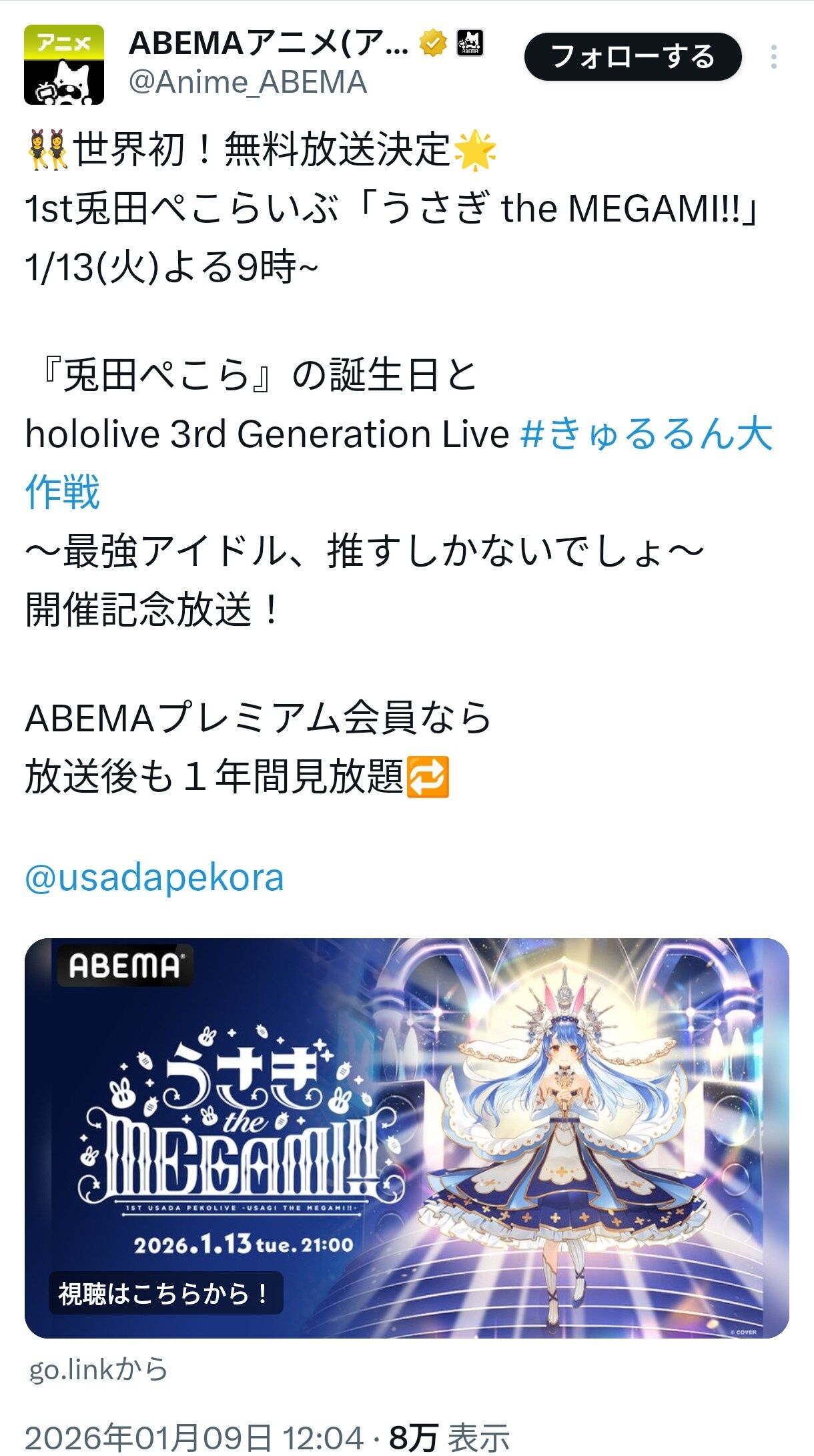 【朗報】超人気Vチューバーさん、アベマでソロライブ無料配信決定! 2026/1/10 ゲーム実況者速報 " " 1: ゲーム実況者速報 2026/01/09(金) 14:40:04.493 ID:CPSdL7tj0 続きを読む Source: ゲーム実況者速報