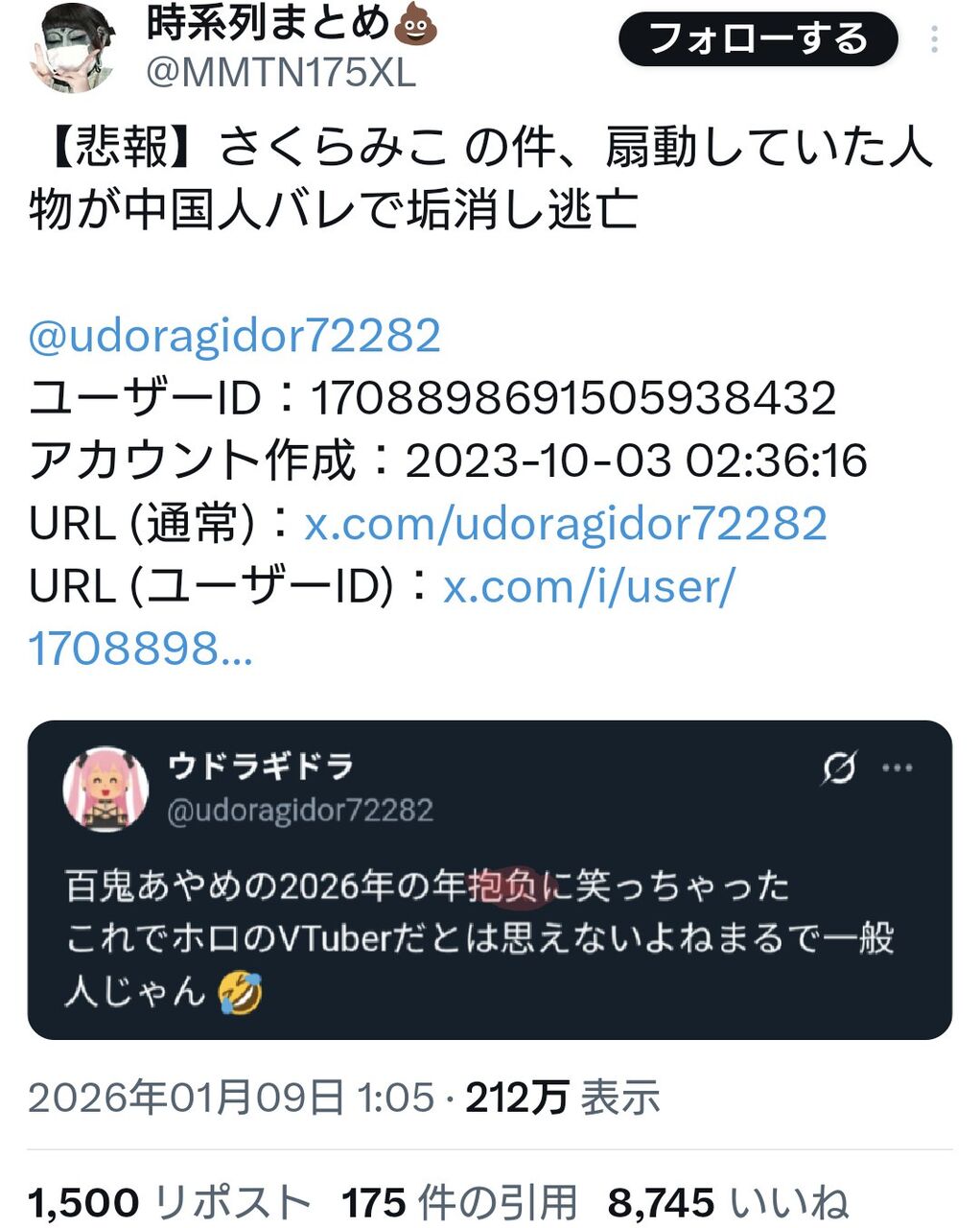 Xで有名なVチューバーアンチさん、中国人だとバレて垢消し逃亡 2026/1/11 ゲーム実況者速報 " " 1: ゲーム実況者速報 2026/01/10(土) 20:20:00.20 ID:zEf7dG+C0● BE:662593167-2BP(2000) 続きを読む Source: ゲーム実況者速報