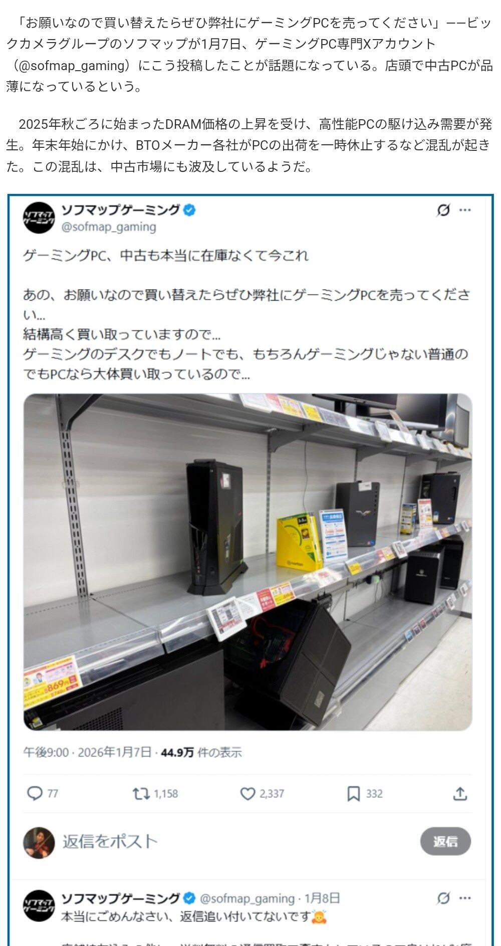 ソフマップ「ゲーミングPCを売ってください(泣)」新品どころか中古もどんどんなくなってる模様 2026/1/12 Y速報 " " 1: 2026/01/10(土) 07:57:52.86 ID:LjHg5lMZ0 どーすんのこれ 続きを読む Source: Y速報