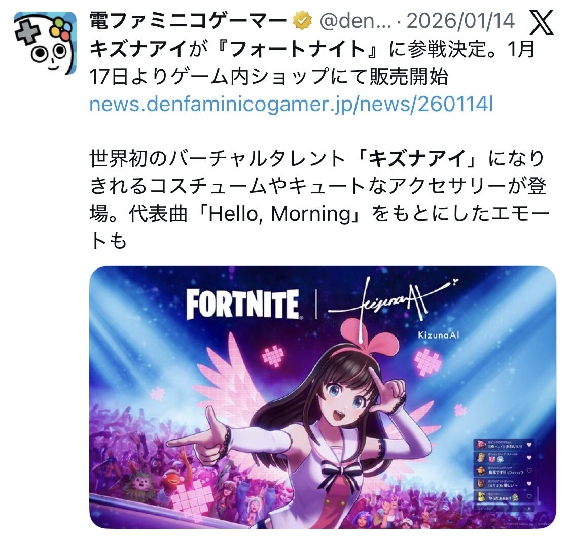 【朗報】キズナアイさん、フォートナイトとコラボ決定! 2026/1/24 ゲーム実況者速報 " " 1: ゲーム実況者速報 2026/01/24(土) 12:17:28.182 ID:+FlLtPKA0 続きを読む Source: ゲーム実況者速報