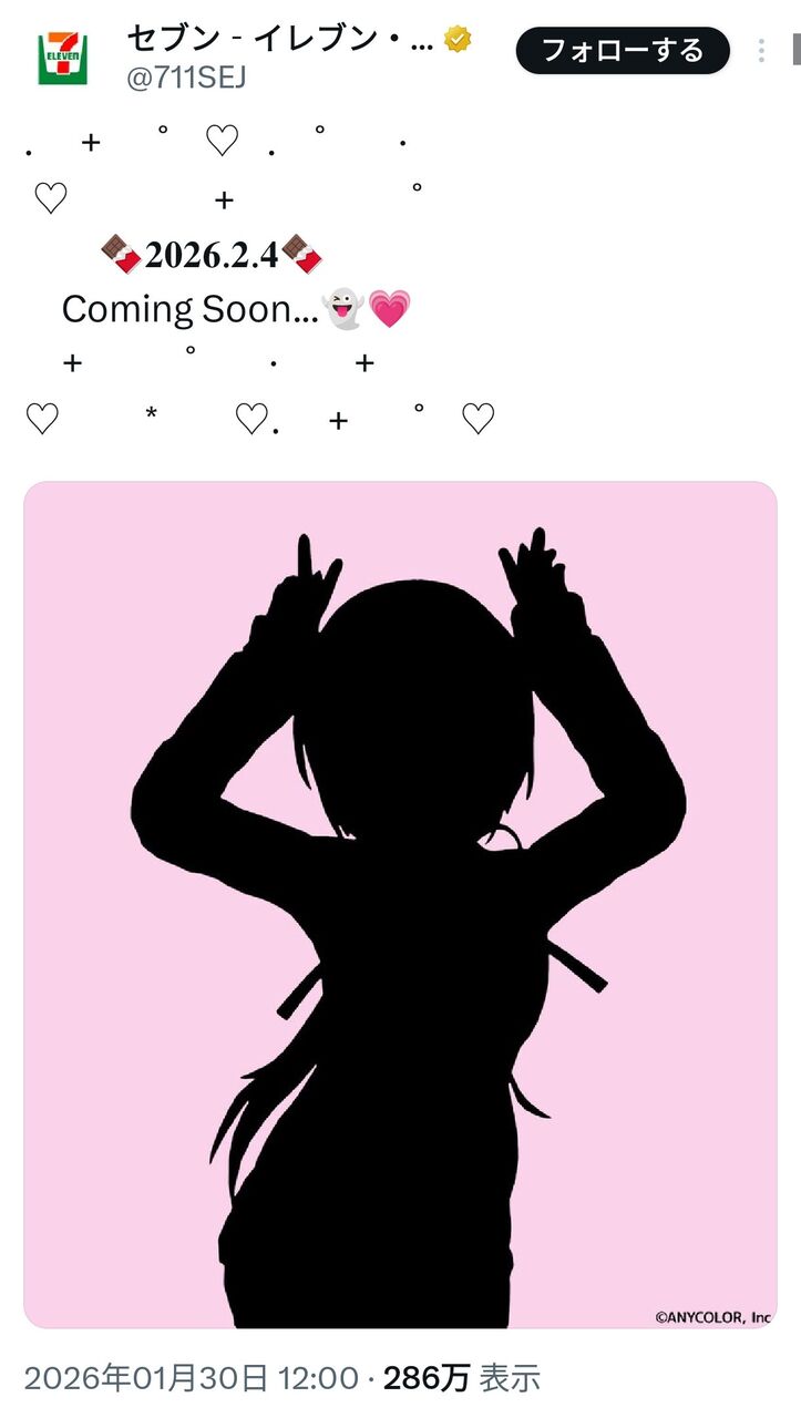 【画像】人気Vチューバーさん、セブンイレブンとバレンタインコラボ? 2026/1/30 ゲーム実況者速報 " " 1: ゲーム実況者速報 2026/01/30(金) 17:22:25.938 ID:oWfjvtTC0 続きを読む Source: ゲーム実況者速報