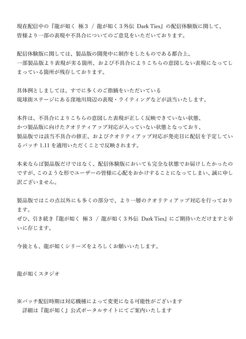 【朗報】龍が如く3極のクソグラ問題、不具合だった 2026/1/31 Y速報 " " 1: 2026/01/30(金) 11:54:38.56 ID:fQWRqV270 龍が如くスタジオ 公式 @ryugagotoku (2026/01/30 10:00:01) 現在配信中の『龍が如く 極3 / 龍が如く3外伝 Dark Ties』の配信体験版に関して 続きを読む Source: Y速報