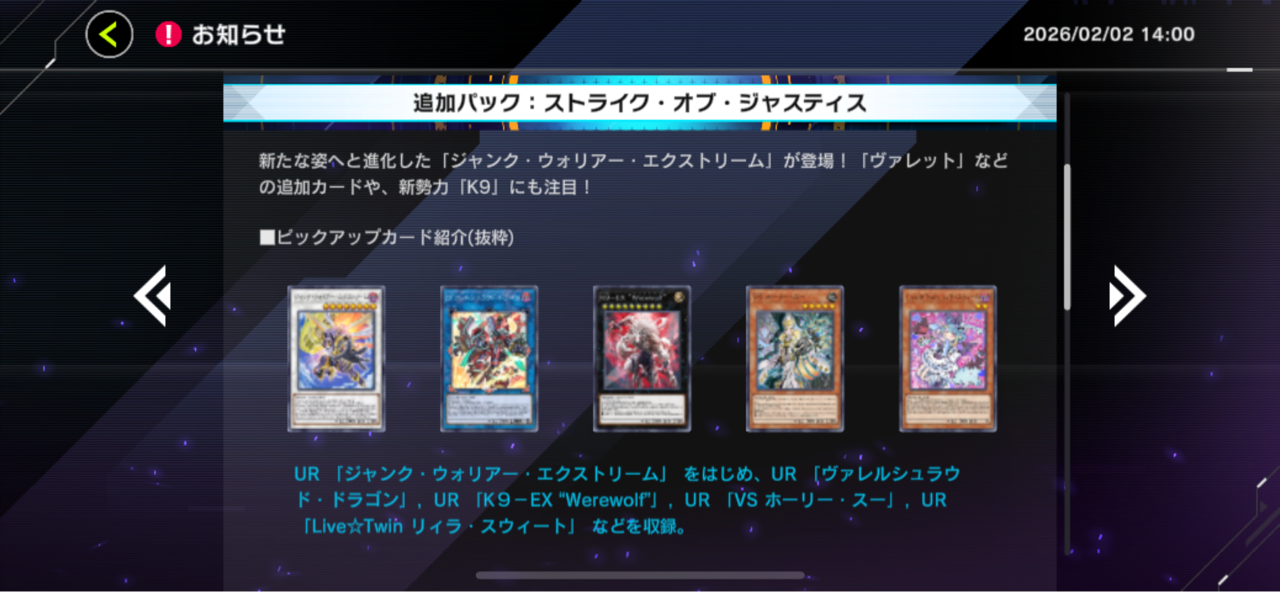 【速報】新パック「ストライク・オブ・ジャスティス」を2/5追加 「K9」きたあああ!!! 2026/2/2 遊戯王デュエルリンクス超速報! " " 続きを読む Source: 遊戯王デュエルリンクス超速報!