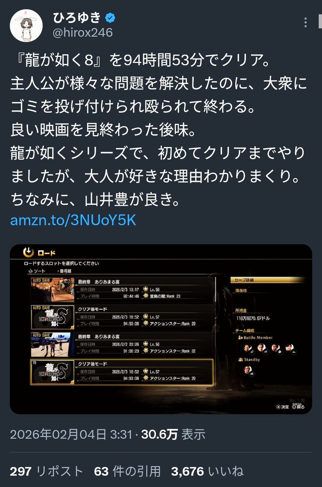 ひろゆき「龍が如く8をクリア。良い映画を見終えた感。大人が好きな理由が解った」 2026/2/5 Y速報 " " 1: 2026/02/04(水) 07:39:05.35 ID:cEuAJXlV0 こういうのを真の大人ゲーって言うんだな 続きを読む Source: Y速報