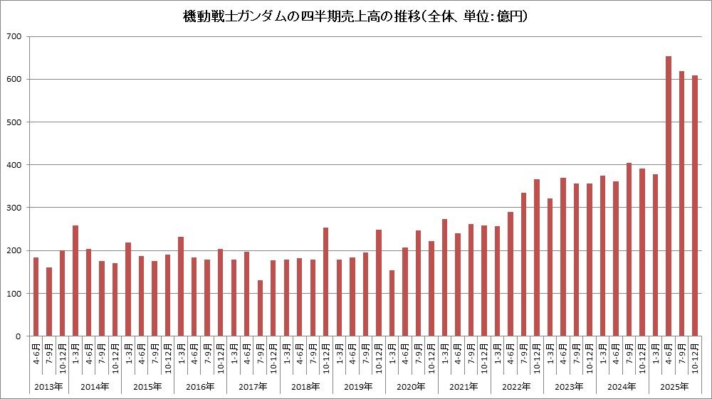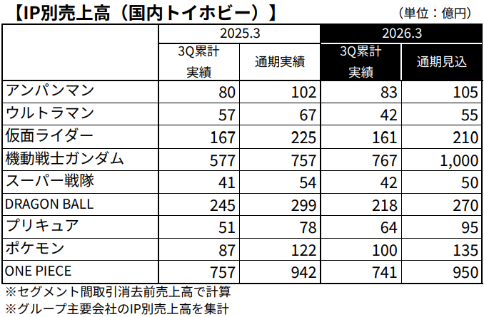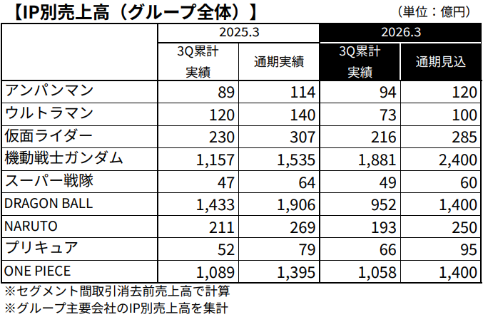 バンダイナムコホールディングス<7832>は、第3四半期におけるIP別売上高を開示し、「機動戦士ガンダム」がグループ全体で前年同期比62.5%増の1881億円と大幅に伸びたことを明らかにした。2026年3月期に入って四半期売上高はすべて600億円の大台を超えるなど大きく成長している。
