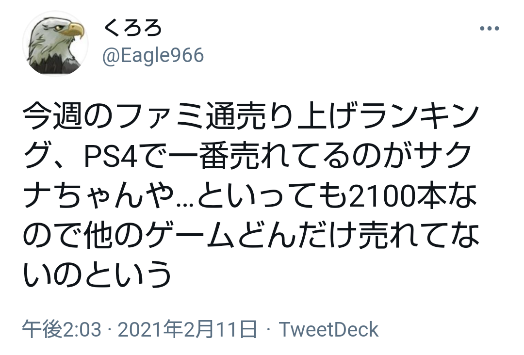 【悲報】サクナヒメ開発者「サクナヒメがPS4の売上トップってどんだけ売れてないんだよ」とつぶやいた結果wwwwww 2021/2/14 Y速報 " " 1: 2021/02/13(土) 09:48:31.05 ID:NDBxMBQJd 今週のファミ通売り上げランキング、PS4で一番売れてるのがサクナちゃんや…といっても2100本なので他のゲームどんだけ売れてないのという (現在はツイート削除済み) http://twitter.com/Eagle966/status/1359729821706645505 続きを読む Source: Y速報